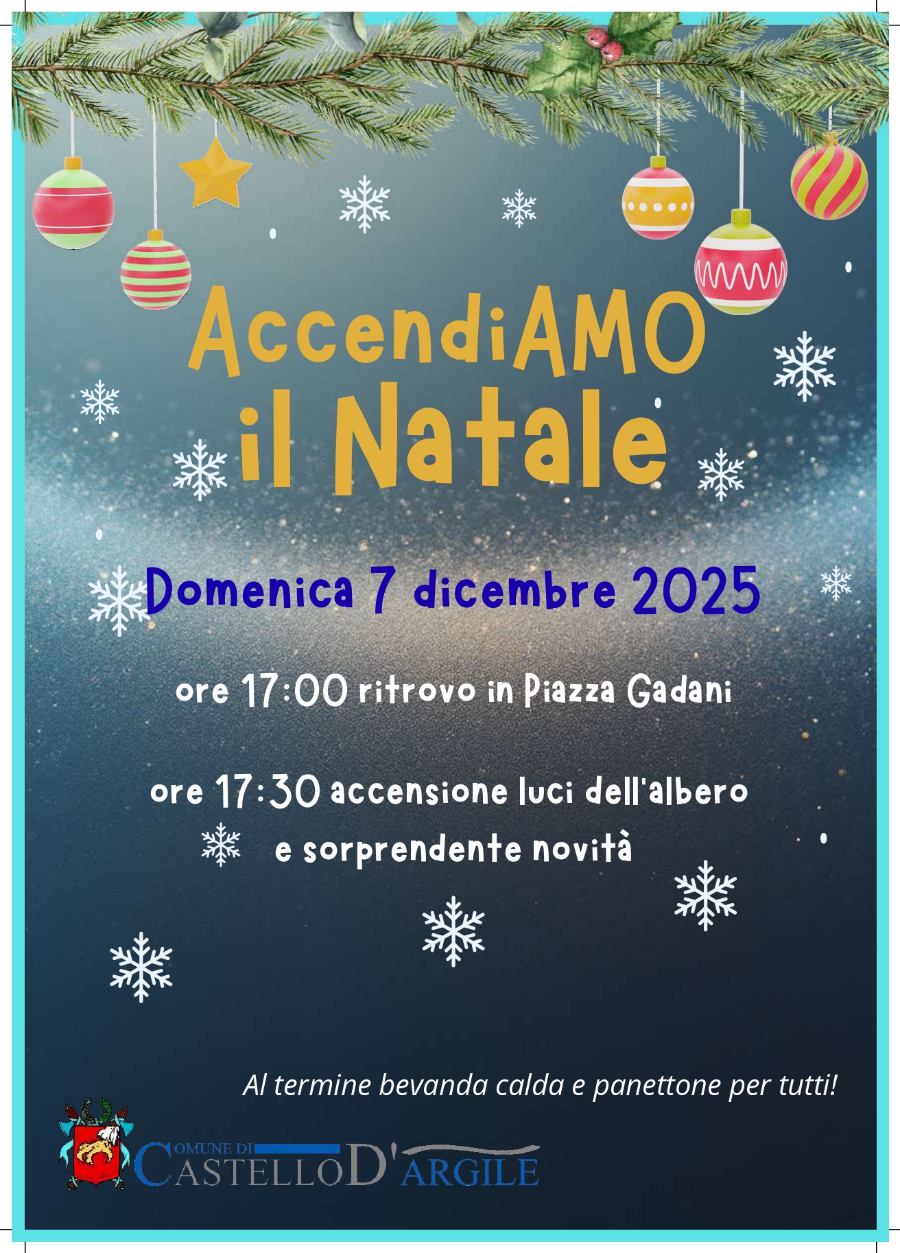 Domenica 7 dicembre 2025 alle ore 17 ritrovo in Piazza Gadani e alle ore 17:30 accensione luci dell'albero e sorprendente novità.