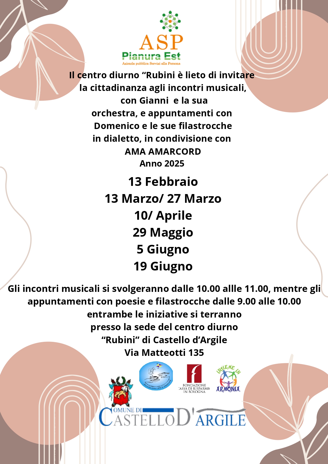 La Cittadinanza è invitata a partecipare agli incontri musicali con Gianni e la sua orchestra ed agli appuntamenti con Domenico e le sue filastrocche in dialetto, che si terranno presso il Centro diurno "Rubini" in Via Matteotti 135, in condivisione con l'Associazione AMA AMARCORD nelle seguenti giornate: