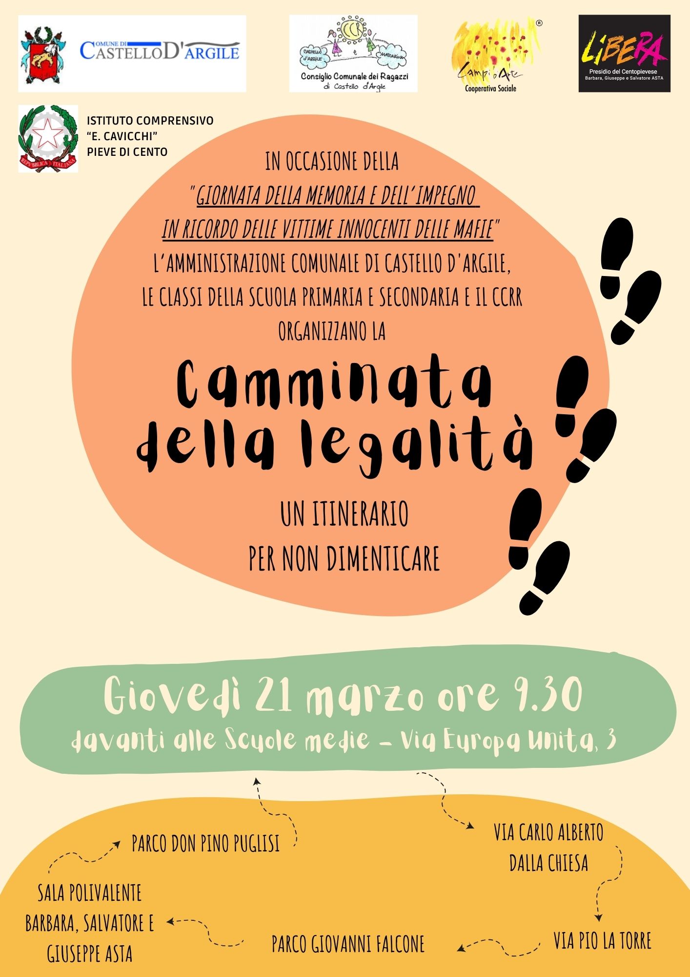 L’Amministrazione Comunale di Castello d’Argile, in collaborazione con il Presidio Libera del cento-pievese, l’Istituto Scolastico “E. Cavicchi” e il Consiglio Comunale dei Ragazzi e delle Ragazze, nel 2023 ha organizzato un itinerario della legalità all’interno del proprio territorio aperto a tutta la cittadinanza e agli studenti, una camminata che ha permesso di riscoprire i luoghi intitolati a vittime innocenti di mafia (Via Pio La Torre, Via Carlo Alberto Dalla Chiesa, Parco don Pino Puglisi, Parco Falcone, Sala polivalente in memoria di Barbara, Salvatore e Giuseppe Asta).