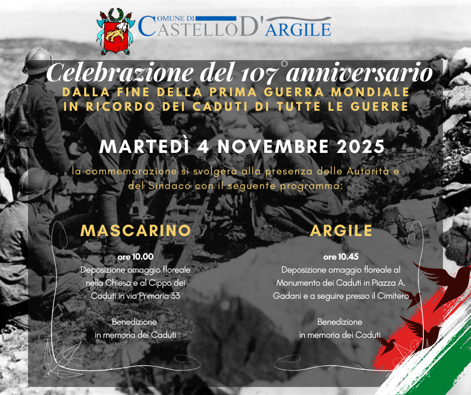 - ore 10,45 Deposizione omaggio floreale al Monumento dei Caduti in Piazza A. Gadani e a seguire presso il Cimitero.