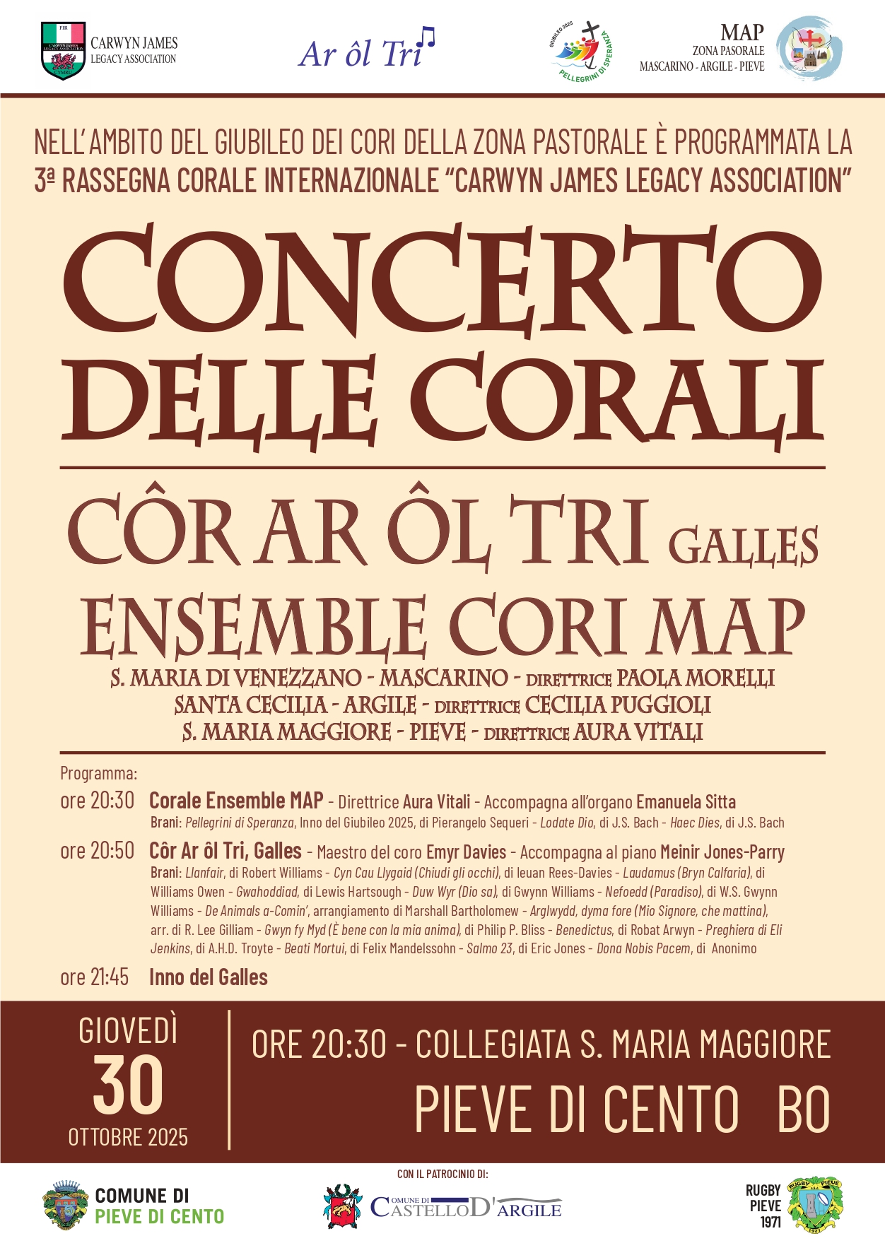 Alle ore 20:30 presso la Collegiata S. Maria Maggiore di Pieve di Cento nell'ambito dei Giubileo dei Cori della zona pastorale è programmata la 3^ Rassegna Corale Internazionale "Carwin James Legacy Association".