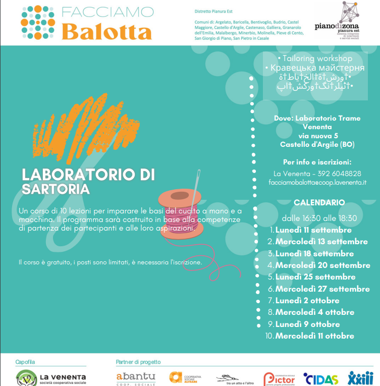 Laboratorio di sartoria, presso il Laboratorio Trame Venenta via nuova 5 Castello d'Argile (BO), dalle 16:30 alle 18:30 dei seguenti giorni: