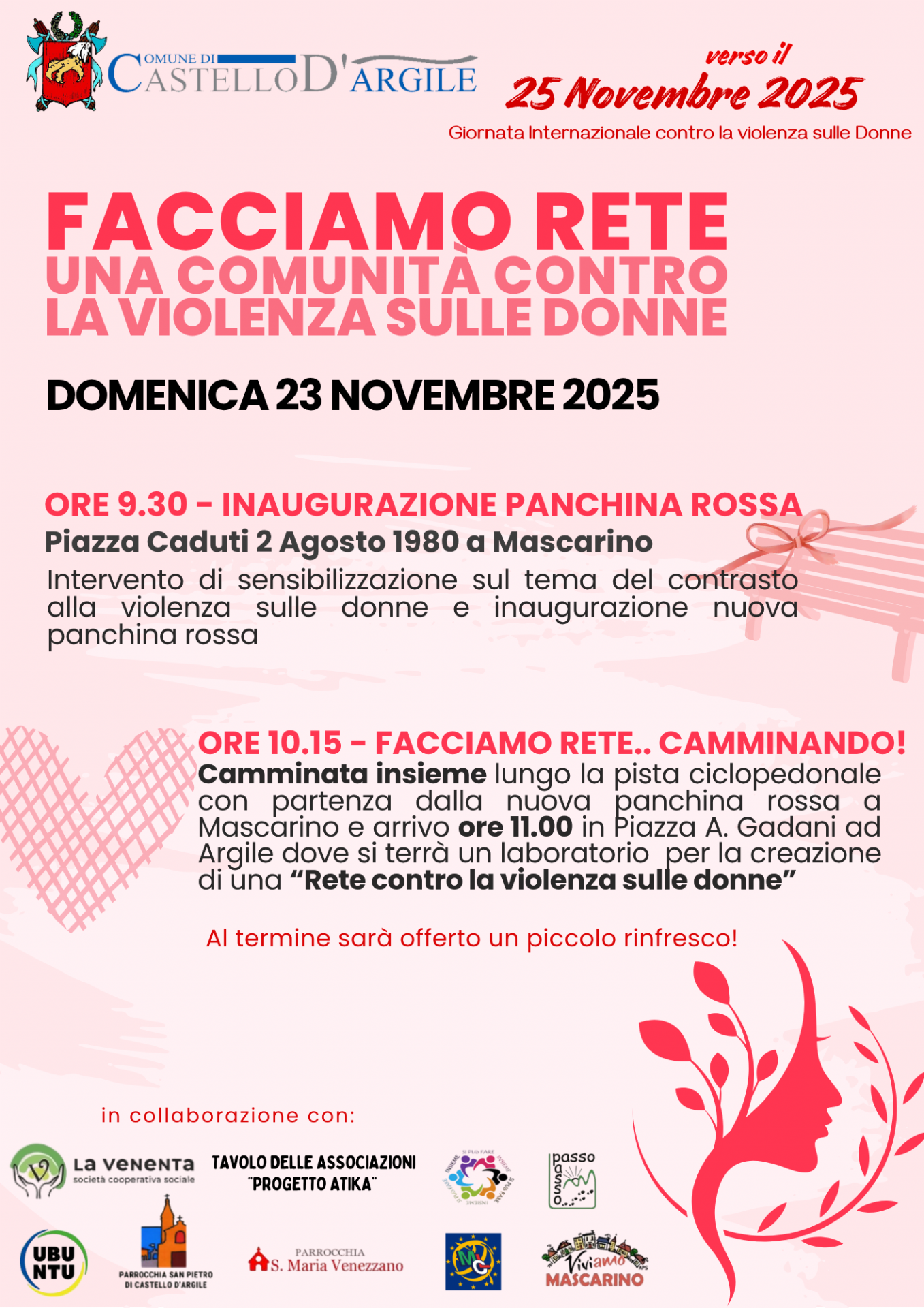 Camminata insieme lungo la pista ciclopedonale con partenza dalla nuova panchina rossa a Mascarino e arrivo ore 11.00 in Piazza A. Gadani ad Argile dove si terrà un laboratorio per la creazione di una “Rete contro la violenza sulle donne”