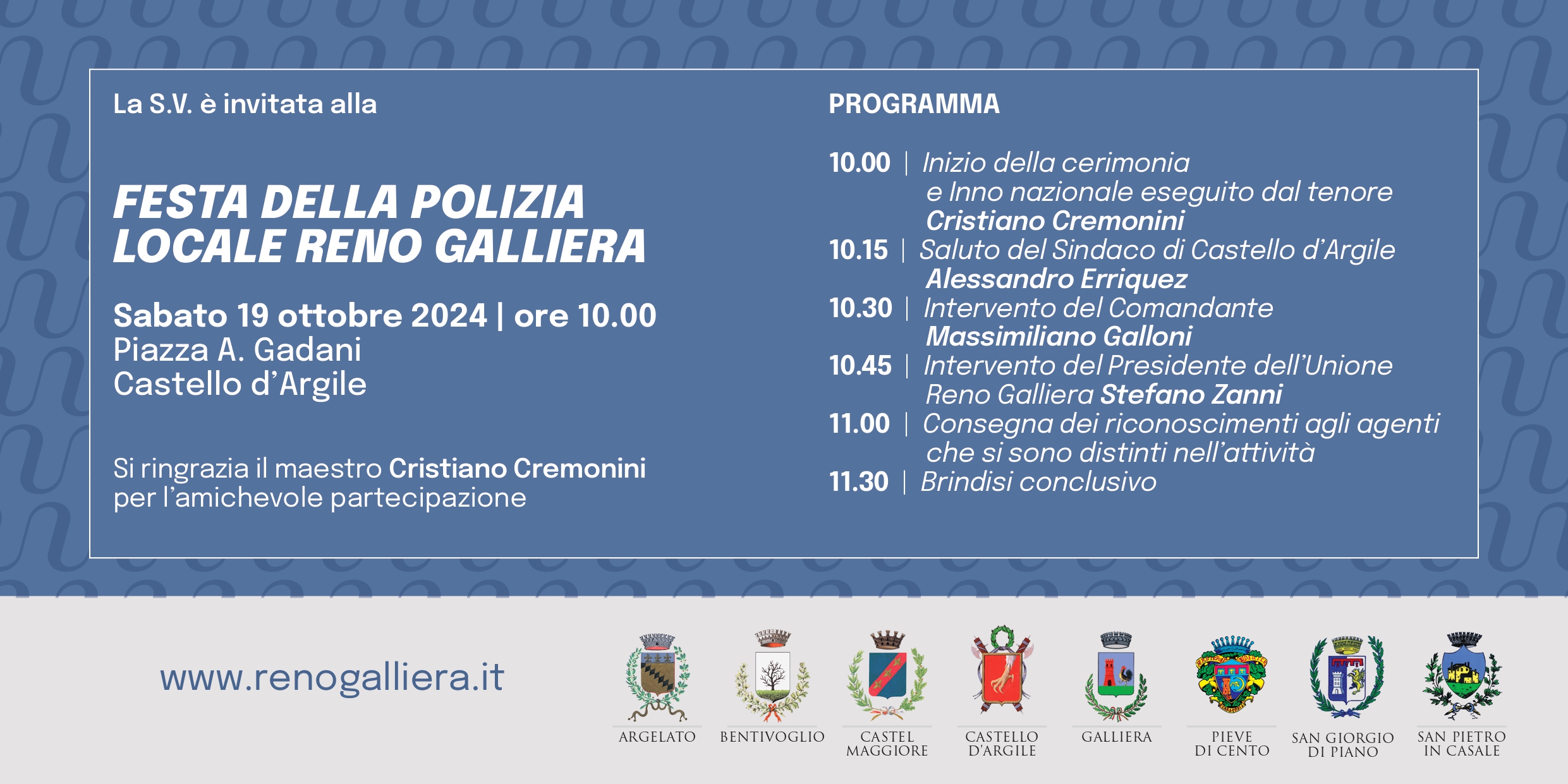Sabato 19 ottobre 2024 in Piazza A. Gadani, a Castello d’Argile, si terrà la Festa della Polizia Locale Reno Galliera