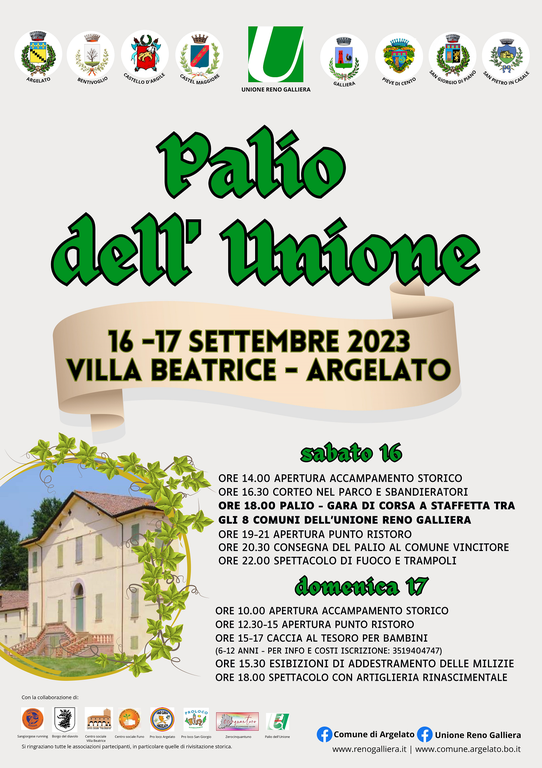 Sabato 16 e domenica 17 settembre 2023 torna il Palio dell'Unione Reno Galliera, rievocazione storica del duecentesco Palio di San Bartolomeo, che giunge quest'anno alla seconda edizione e che sarà ospitato dal Comune di Argelato, vincitore della prima edizione.