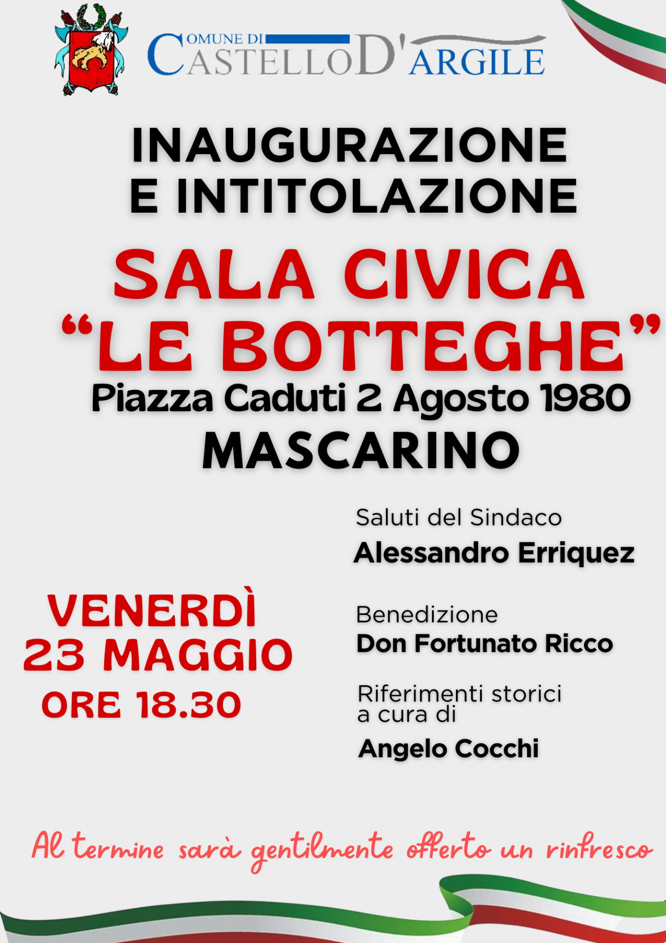 Inaugurazione e intitolazione della SALA CIVICA "LE BOTTEGHE" in Piazza Caduti del 2 Agosto 1980 a Mascarino
