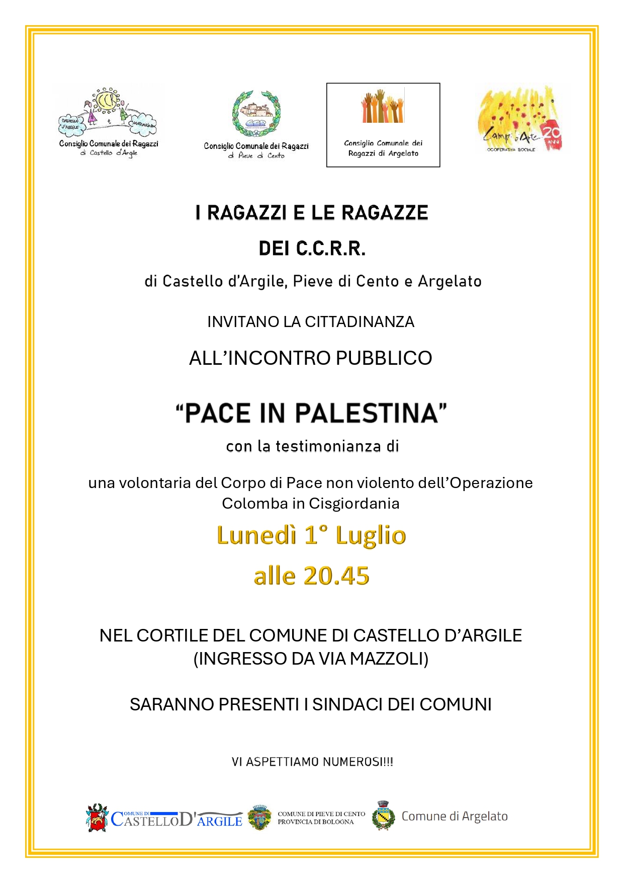 I ragazzi e le ragazze del C.C.R.R. di Castello d'Argile, Pieve di Cento e Argelato invitano la cittadinanza all'incontro pubblico "PACE IN PALESTINA" con la testimonianza di una volontaria del Corpo di Pace non violento dell’Operazione Colomba in Cisgiordania