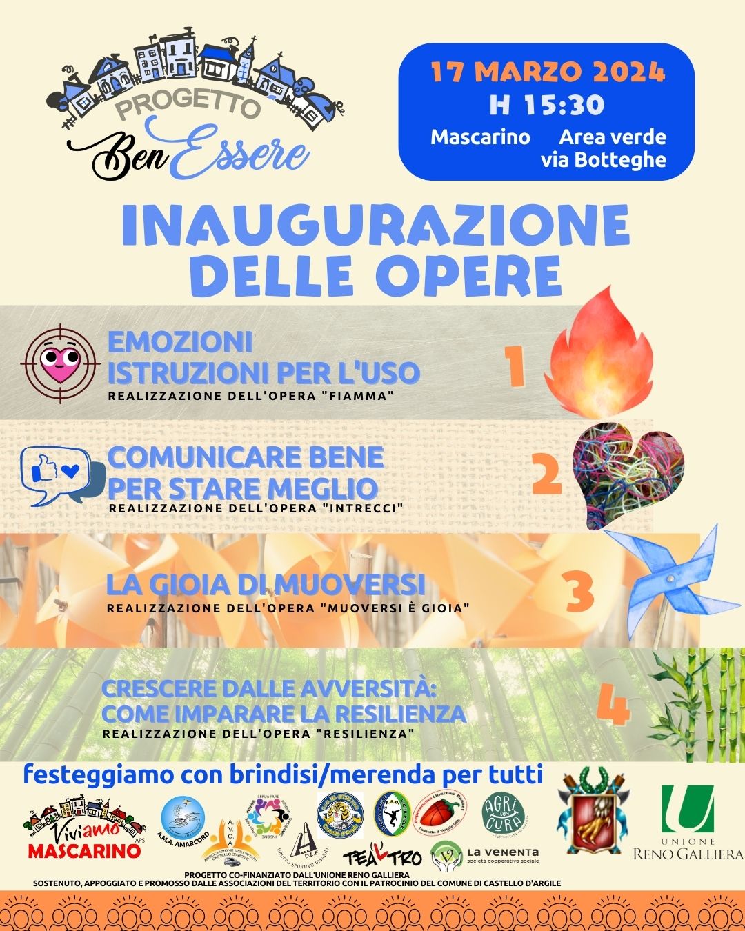 Domenica 17 marzo 2024 alle ore 15.30 nell'Area verde di Via Botteghe a Mascarino verranno inaugurate le opere del Progetto Benessere.
