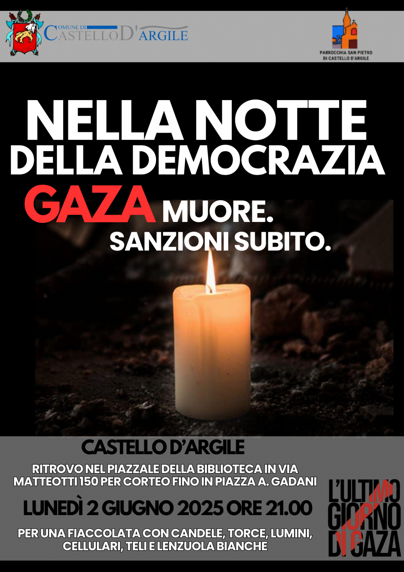 Il Comune di Castello d'Argile organizza per LUNEDI' 2 GIUGNO 2025 alle ore 21,00 una fiaccolata per chiedere la Pace nell'ambito dell'iniziativa nazionale "Nella notte della democrazia, Gaza muore".