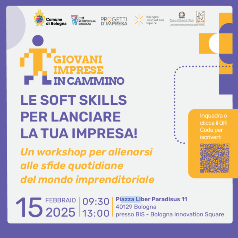 Progetti d'impresa organizza il workshop gratuito LE SOFT SKILLS PER LANCIARE LA TUA IMPRESA! nell'ambito del Progetto Giovani Imprese in Cammino in collaborazione con Iscom Bologna.